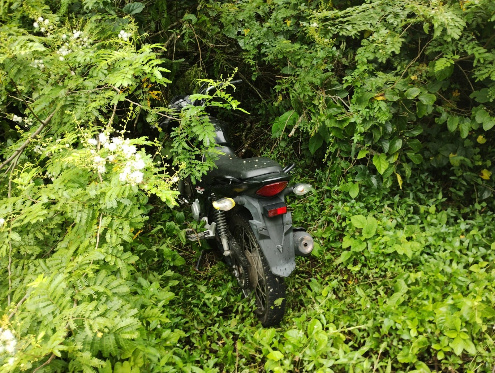 De acordo com informação da PM, durante patrulhamento os policiais, visualizaram o portão de um terreno caído no bairro, tendo uma vasta vegetação aos fundos. Suspeitando de uma possível invasão, adentraram para averiguar o local, onde localizou uma motocicleta CG 160 preta sem placa escondida no meio do mato.