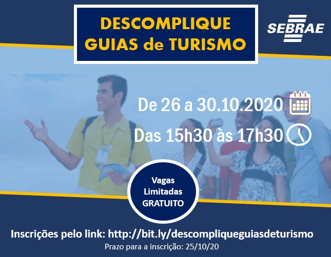 O programa envolve temas relacionados ao empreendedorismo, marketing, ideia de negócios, finanças e formalização. As inscrições podem ser feitas gratuitamente pelo link https://www.sympla.com.br/descomplique-guia-turistico__990076. As vagas são limitadas.